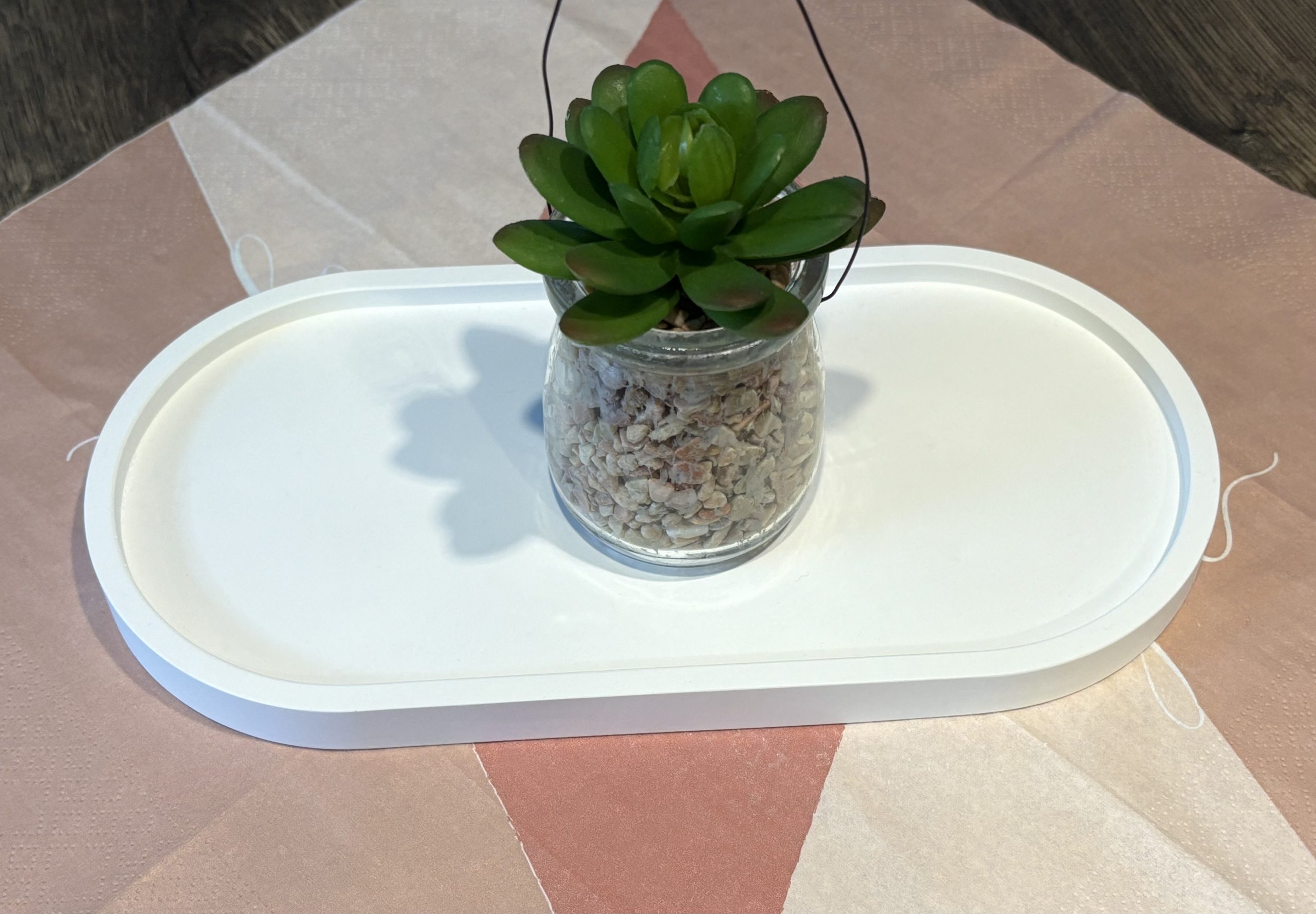 Dieses wunderschöne längliche dekorative Tablett in ovaler Form ist vielseitig einsetzbar als Untersetzer für Kerzen oder Blumentöpfchen, aber auch als Parkplatz für Eure eingepackten Süßigkeiten sehr gut geeignet. Als Schmuckablage kann es ebenfalls sehr gut dienen.