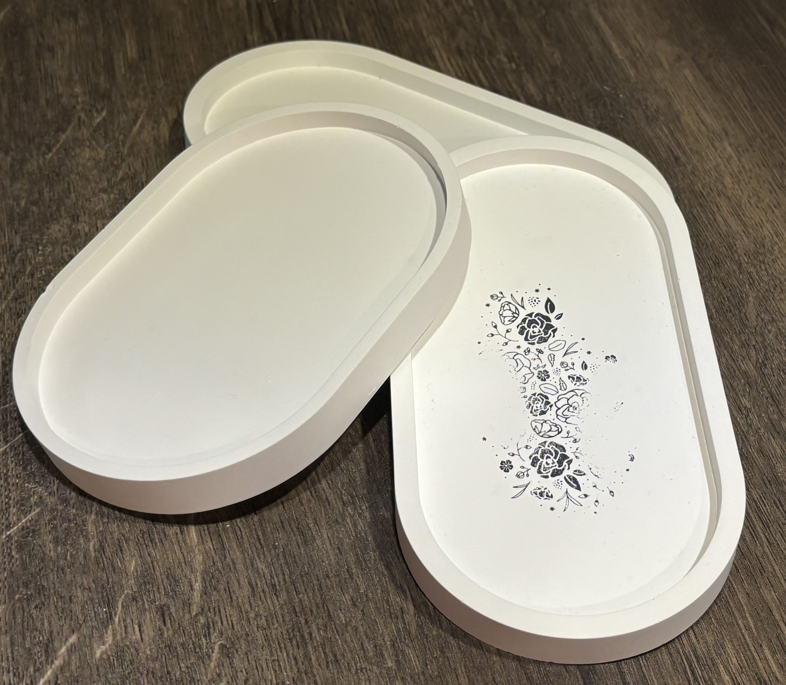 Dieses wunderschöne mittelgroße dekorative Tablett in ovaler Form ist vielseitig einsetzbar als Untersetzer für Kerzen oder Blumentöpfchen, aber auch als Parkplatz für Eure eingepackten Süßigkeiten sehr gut geeignet. Als Schmuckablage kann es ebenfalls sehr gut dienen.