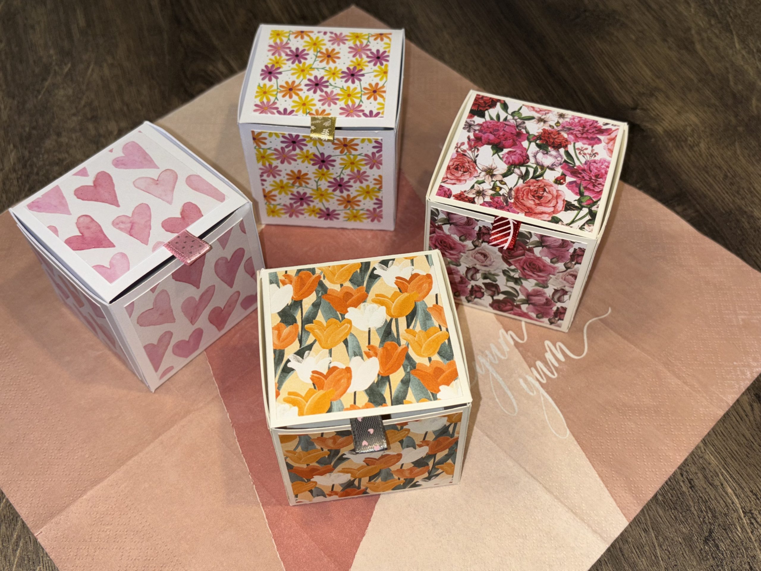 Die Schachteln sind aus kräftigem Farbkarton gebastelt und mit verschiedenen Designerpapieren verziert. An der Deckelklappe befindet sich eine kleine Stofflasche zum leichteren Öffnen.