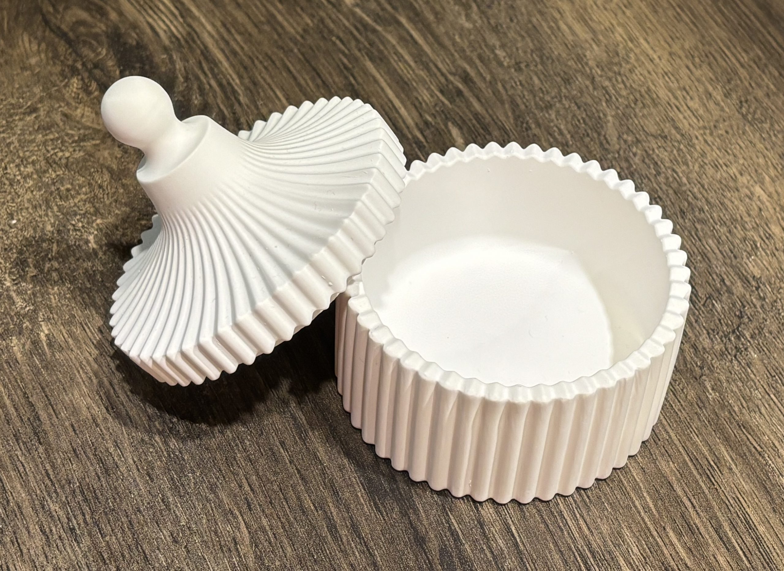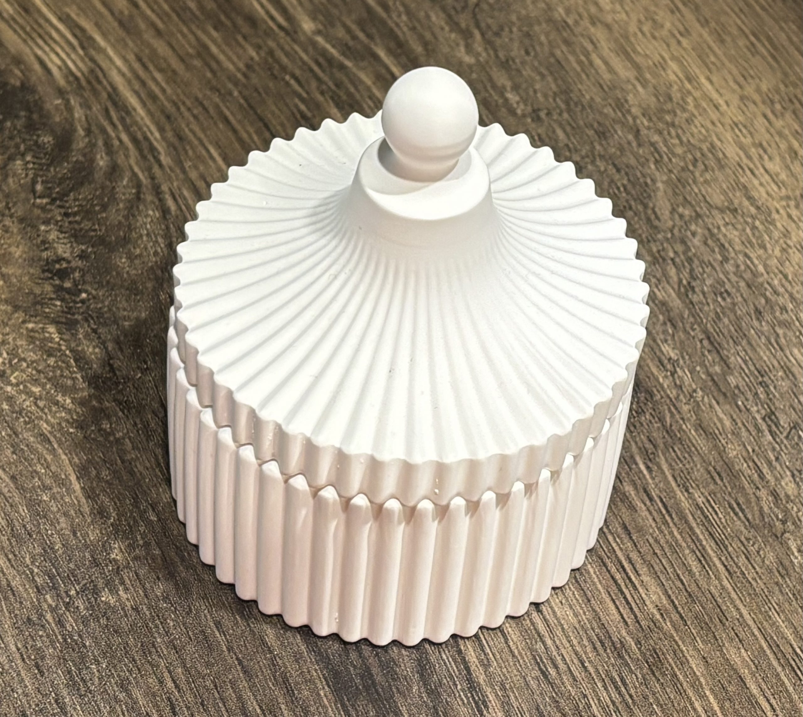 Die Schale mit Deckel und Rillenmuster und niedlichem Knauf oben drauf eignet sich wunderbar zur Aufbewahrung von Schmuck, verpackten Süßigkeiten oder anderen Kleinigkeiten.